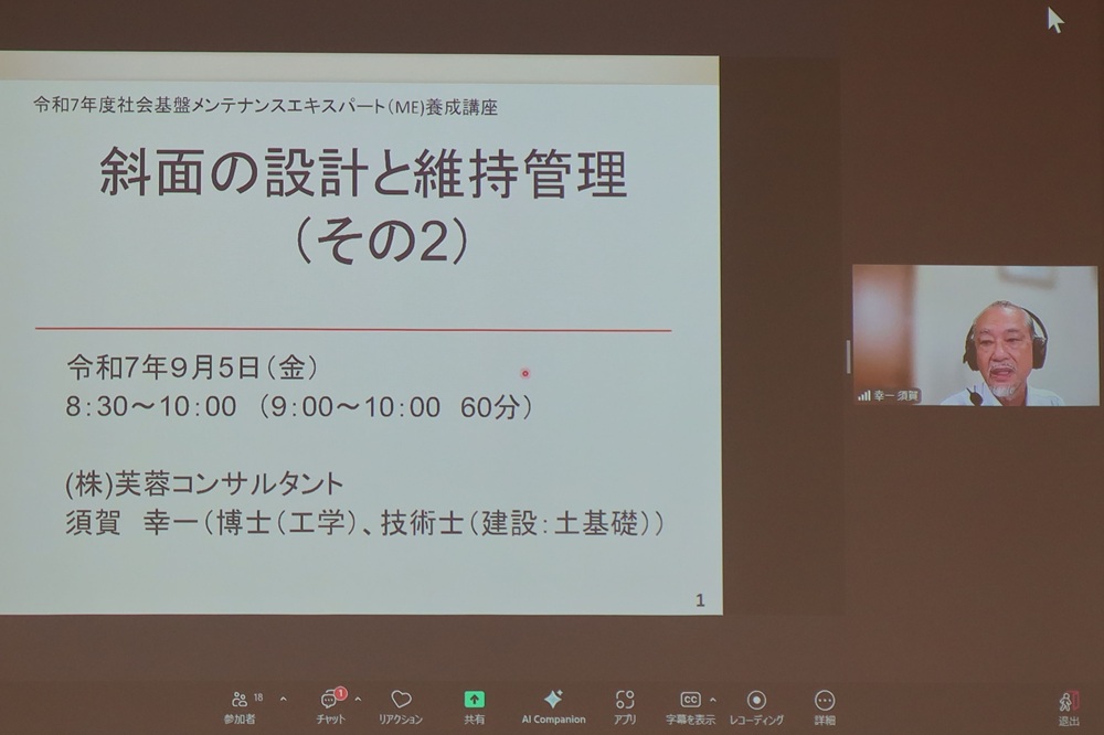 令和7年度 愛媛大学 社会基礎メンテナンスエキスパート養成講座(9/5) お知らせ2025.10.14 令和7年9月5日(金)に行われた社会基礎メンテナンスエキスパート養成講座にて当社の須賀が講師を務めました。 講座では、「斜面の設計と維持管理」と題して、表層崩壊や地すべりが起こる原因と対策工の設計事例等について説明が行われました。 一覧へ戻る トップページへ戻る トップページへ戻る