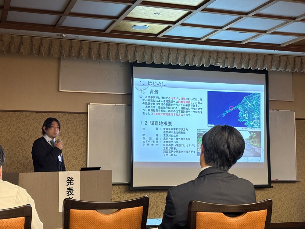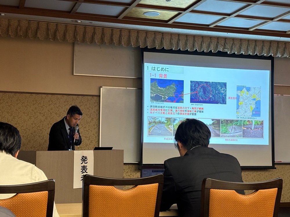 論文内容:地すべり地における路面沈下の観測結果を基に、路面の沈下量計測データ解析を主とした不安定化域を推定する方法について発表
