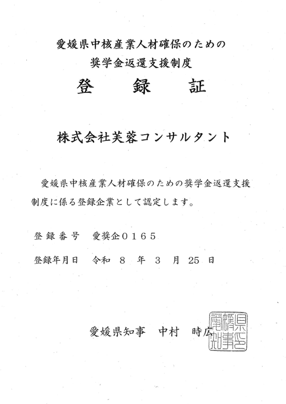 令和8年3月25日(水)に愛媛県中核産業人材確保のための奨学金返還支援制度に係る登録企業として認定を受けました。