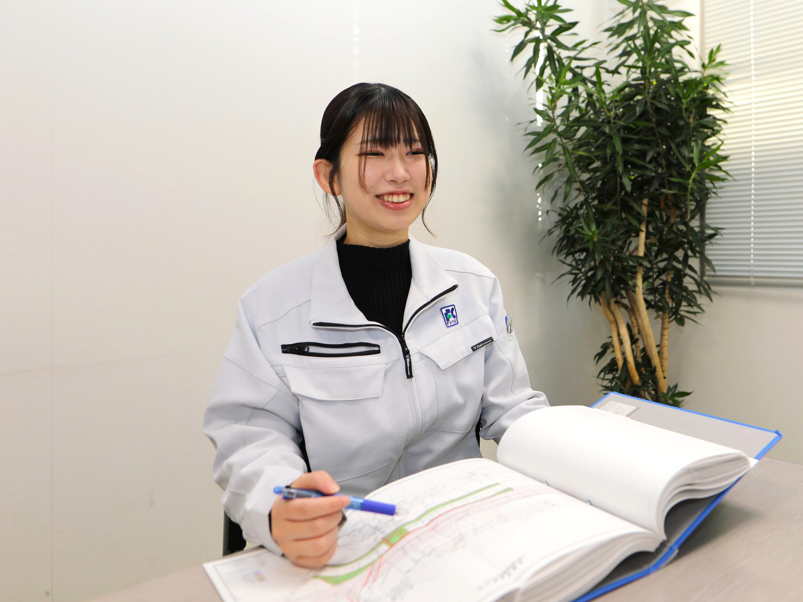 入社1年目で営業部に所属しており、主に、入札・契約に関する事務処理や見積書の作成を上司の指導の下で行っています。文系大学出身であることや、土木知識が乏しかったため入社当初は不安でしたが、若手社員を対象とした社内研修が充実していることや、部署問わず人間関係など社内の雰囲気が良く、当初の不安がなくなりました。